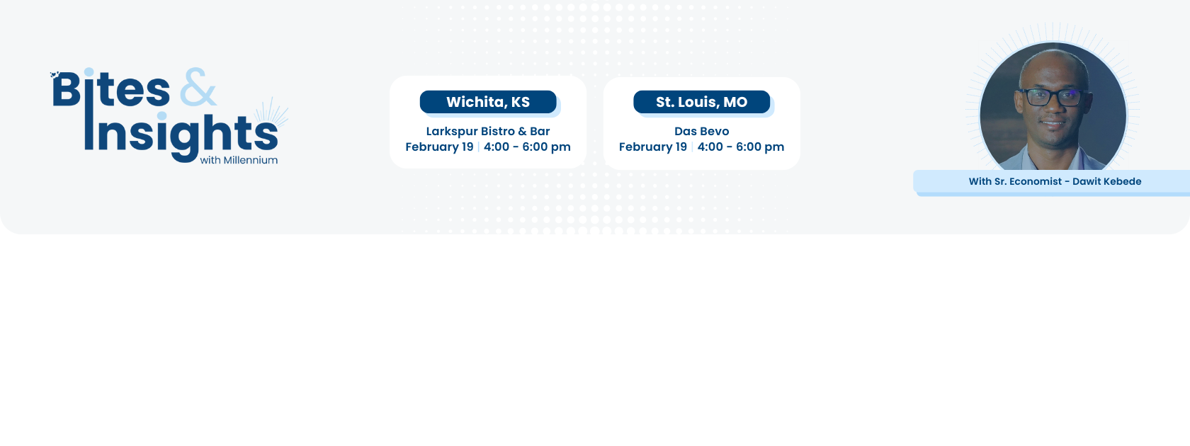 Join Millennium Corporate for Bites & Insights in Wichita, KS - a two-hour gathering amongst credit union peers that pairs great food and timely conversation with a virtual economic update from America’s Credit Unions Senior Economist, Dawit Kebede.